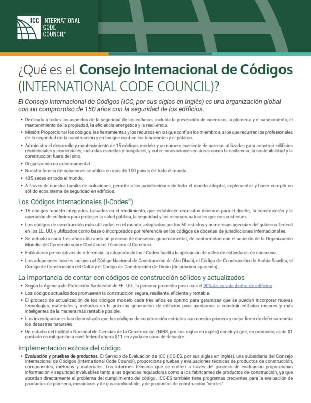 El Consejo Internacional de Códigos (ICC, por sus siglas en inglés) es una organización global con un compromiso de 150 años con la seguridad de los edificios. ■ Dedicado a todos los aspectos de la seguridad de los edificios, incluida la prevención de incendios, la plomería y el saneamiento, el mantenimiento de la propiedad, la eficiencia energética y la resiliencia. ■ Misión: Proporcionar los códigos, las herramientas y los recursos en los que confían los miembros, a los que recurren los profesionales de la seguridad de la construcción y en los que confían los fabricantes y el público.